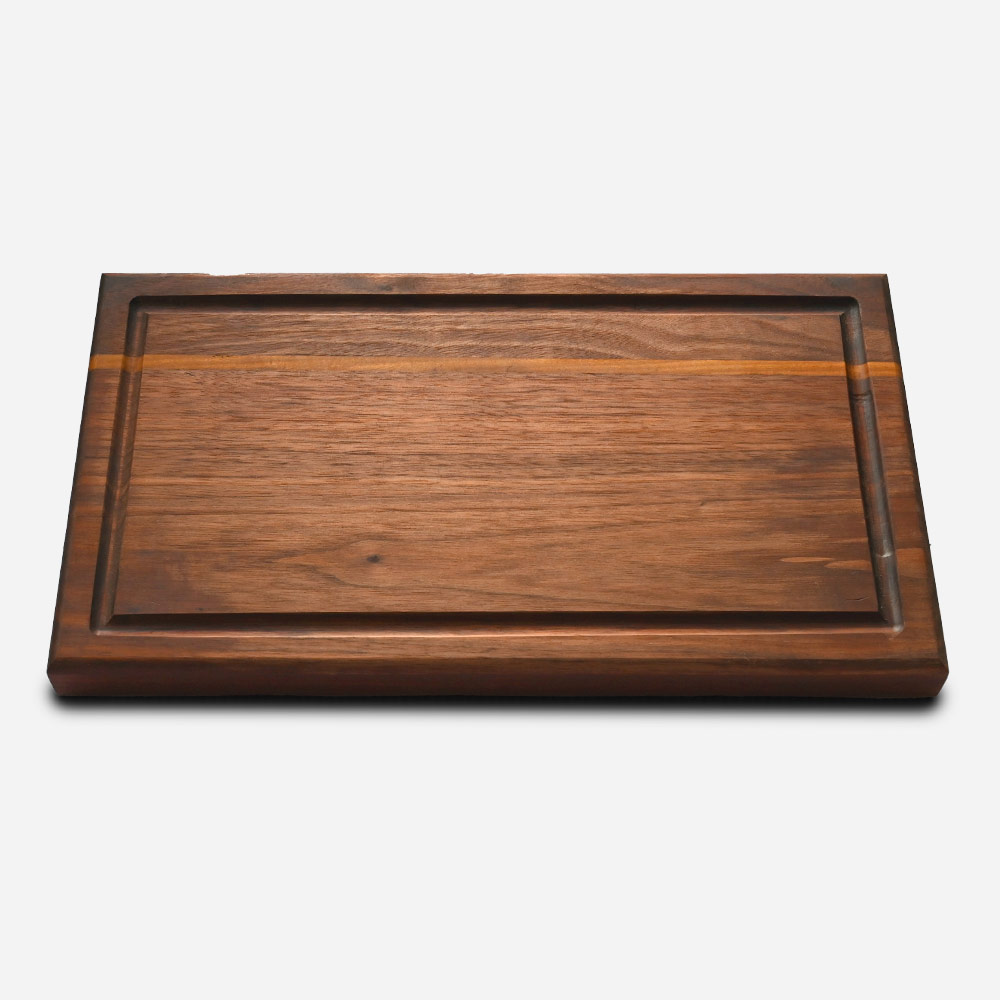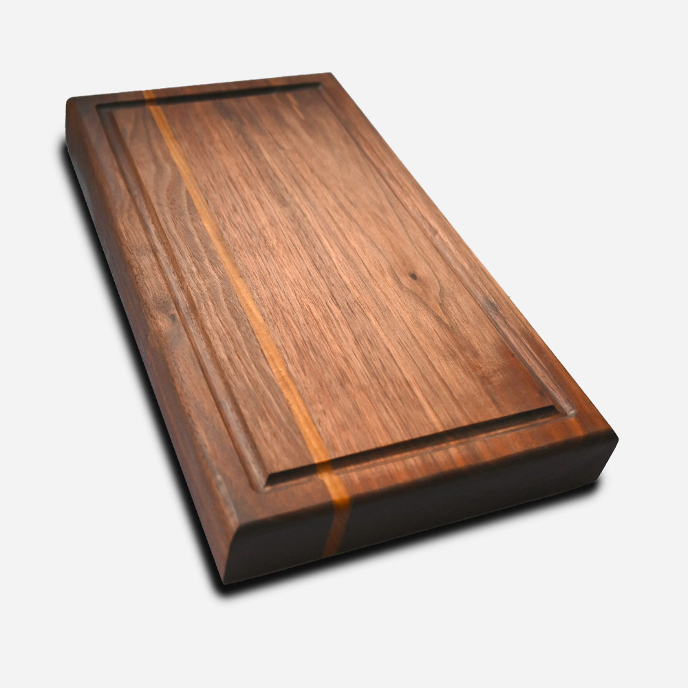 Deze luxe snijplank, op maat gemaakt van exclusief Amerikaans walnotenhout, is een ware eyecatcher in je keuken. Het massieve hout heeft een rijke, diepe kleur en een prachtig nerfpatroon, waardoor elke plank uniek is. Wat deze snijplank écht bijzonder maakt, is de subtiele oranje horizontale lijn die het ontwerp een verfijnde en moderne uitstraling geeft. Dit elegante detail maakt de plank niet alleen functioneel, maar ook een stijlvol element in je keukeninterieur.